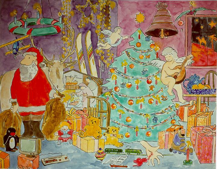 Quizfrage: Wo ist Jesus? Nimm dir Zeit die Karikatur etwas genauer zu untersuchen. Wo ist Jesus? Bei all diesem Glanz und Glimmer ist er scheinbar ganz vergessen gegangen. Advent, Einkaufsstress, Weihnachtsgebäck, oh Tannenbaum, oh Tannenebaum, Festgelage, lange Wunschzettel, der Weihnachtsmann, Geschenksrausch, Harmoniezwang, Gänsebraten, Kerzenschein, Völlegefühle, Glockengeläute, Weihnachtsgeschäft und Jahresumsatzzahlen, Engelgesang, Fernsehweihnachtsprogramm, Katzenjammer, Aufräumen! Die totale Weihnacht – nur ein paar Tage im Kalender eines Jahres! Weihnachen ist das, was wir aus ihr gemacht haben. Weihnachten wird auch dieses Jahr nur sein, was jeder einzelne selber aus ihr macht. Und wo ist nun dieser Jesus? Schliesslich ist Weihnachten ja sein Geburtstagsfest. In der Krippe, das kleine Kind? Das ist nur tote Materie, eine Krippenfigur eben. Der wirkliche Jesus liegt unter dem Tannenbaum und den Geschenken begraben. Seine Hand streckt er dir entgegen. Eine Hand, von einem Nagel durchbohrt. Nutze die Gunst der Stunde! Fass die Hand. Zieh diesen Jesus unter all diesem Glanz und Glimmer hervor und widme dich ganz ihm. Das wäre Weihnachten.